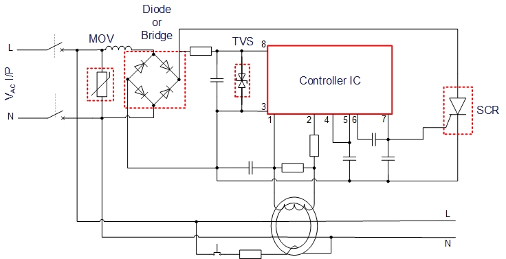 漏電保護(hù)器,簡(jiǎn)稱(chēng)漏電開(kāi)關(guān),又叫漏電斷路器,主要是用來(lái)在設(shè)備發(fā)生漏電故障時(shí)以及對(duì)有致命危險(xiǎn)的人身觸電保護(hù),具有過(guò)載和短路保護(hù)功能,可用來(lái)保護(hù)線路或負(fù)載的過(guò)載和短路,亦可在正常情況下作為線路的不頻繁轉(zhuǎn)換啟動(dòng)之用。 目前市場(chǎng)上使用的漏電保護(hù)裝置種類(lèi)繁多,但大體的原理都相差不大。漏電保護(hù)器主要是由三部分組成:檢測(cè)元件、中間放大環(huán)節(jié)、操作執(zhí)行機(jī)構(gòu) 1. 檢測(cè)元件:由電流互感器組成,檢測(cè)漏電電流并發(fā)出信號(hào) 2. 放大環(huán)節(jié):將微弱的漏電信號(hào)放大,按裝置不同可采用機(jī)械式或電子式 3. 執(zhí)行機(jī)構(gòu):收到信號(hào)可控硅由斷開(kāi)狀態(tài)變?yōu)閷?dǎo)通狀態(tài),主線圈通電后,主開(kāi)關(guān)由閉合狀態(tài)轉(zhuǎn)換為斷開(kāi)狀態(tài),從而切斷電源 應(yīng)用于漏電保護(hù)器領(lǐng)域,捷捷微電 能提供比較齊全的元件解決方案。比如:AC 輸入端防浪涌的壓敏電阻(MOV)、對(duì)交流進(jìn)行整流的高壓整流二極管 (Diode) 或者是整流橋(Bridge)、對(duì)電源端進(jìn)行過(guò)壓防護(hù)的瞬態(tài)抑制二極管(TVS)、整個(gè)電路的控制核心集成電路(IC)、電路動(dòng)作執(zhí)行機(jī)構(gòu)(SCR)等。